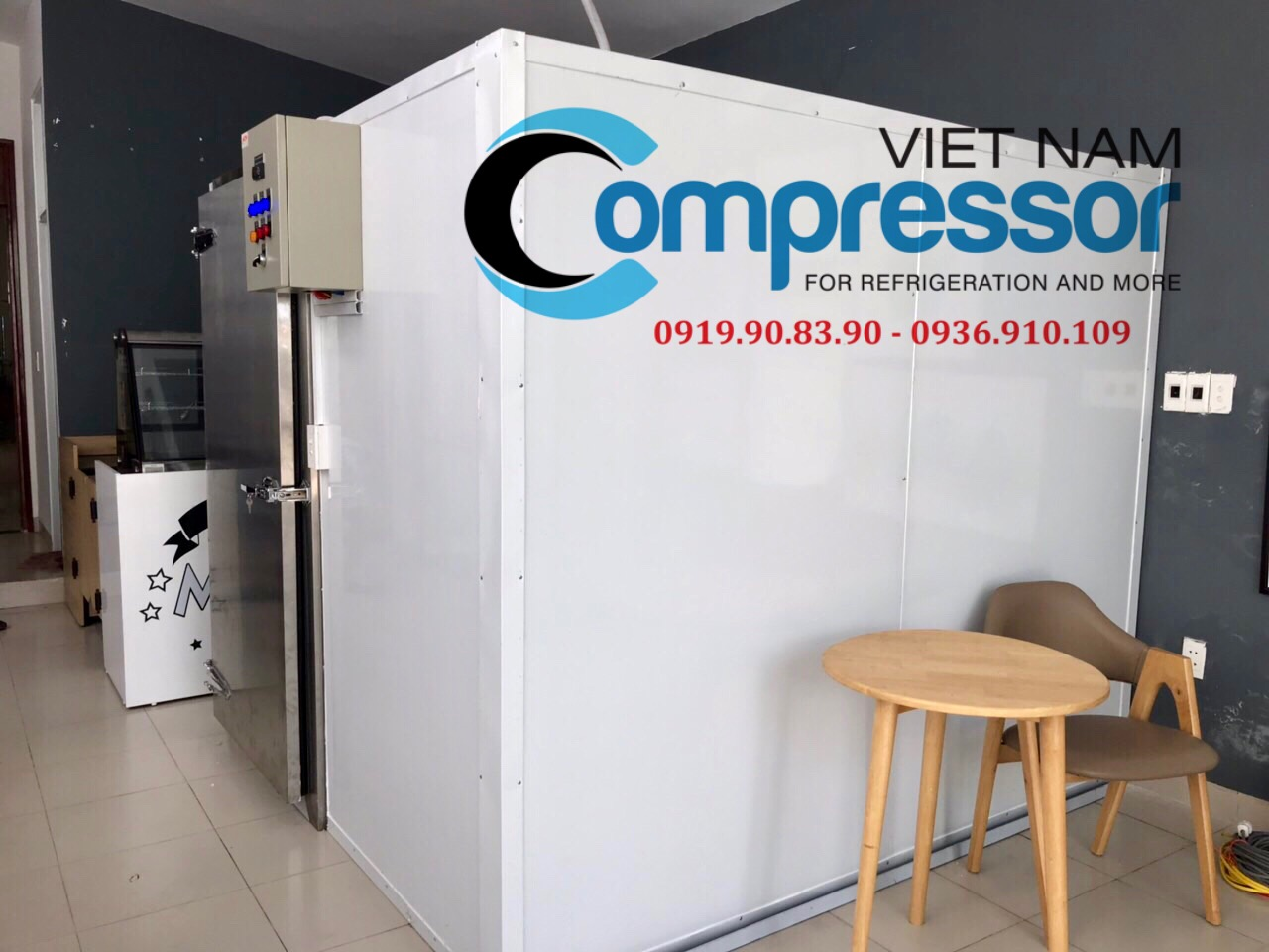 Hệ thống máy: Cụm máy nén Tecumseh công suất 2HP, điện áp 220V/1P/50Hz, lắp đặt tại Compressor Vietnam.